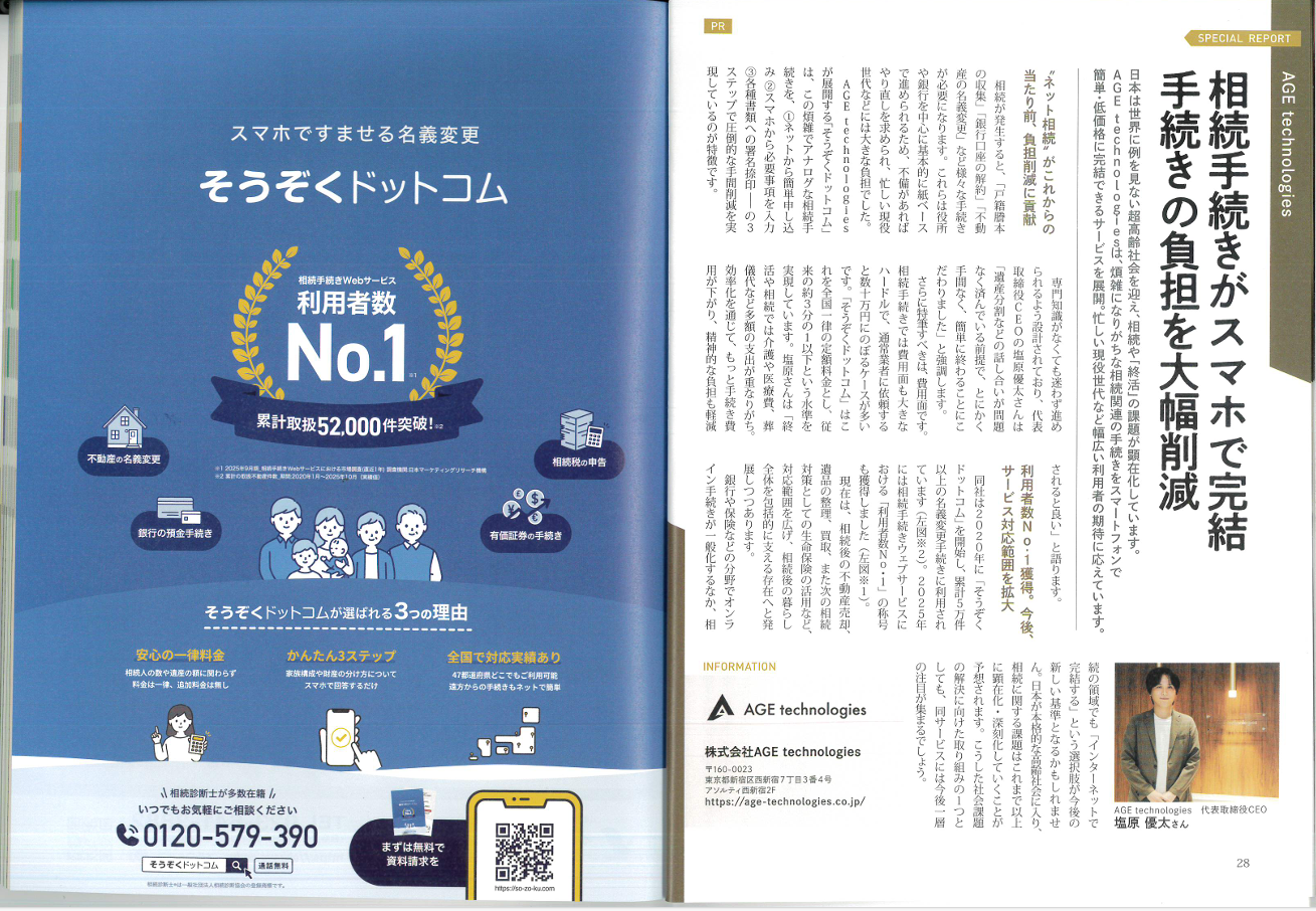 株式会社AGE technologies(本社:東京都新宿区、代表取締役CEO:塩原 優太)は、当社が提供するオンライン相続手続きサービス「そうぞくドットコム」が、日本経済新聞出版発行の日経MOOK特集企画にてタイアップ記事として掲載されたことをお知らせします。